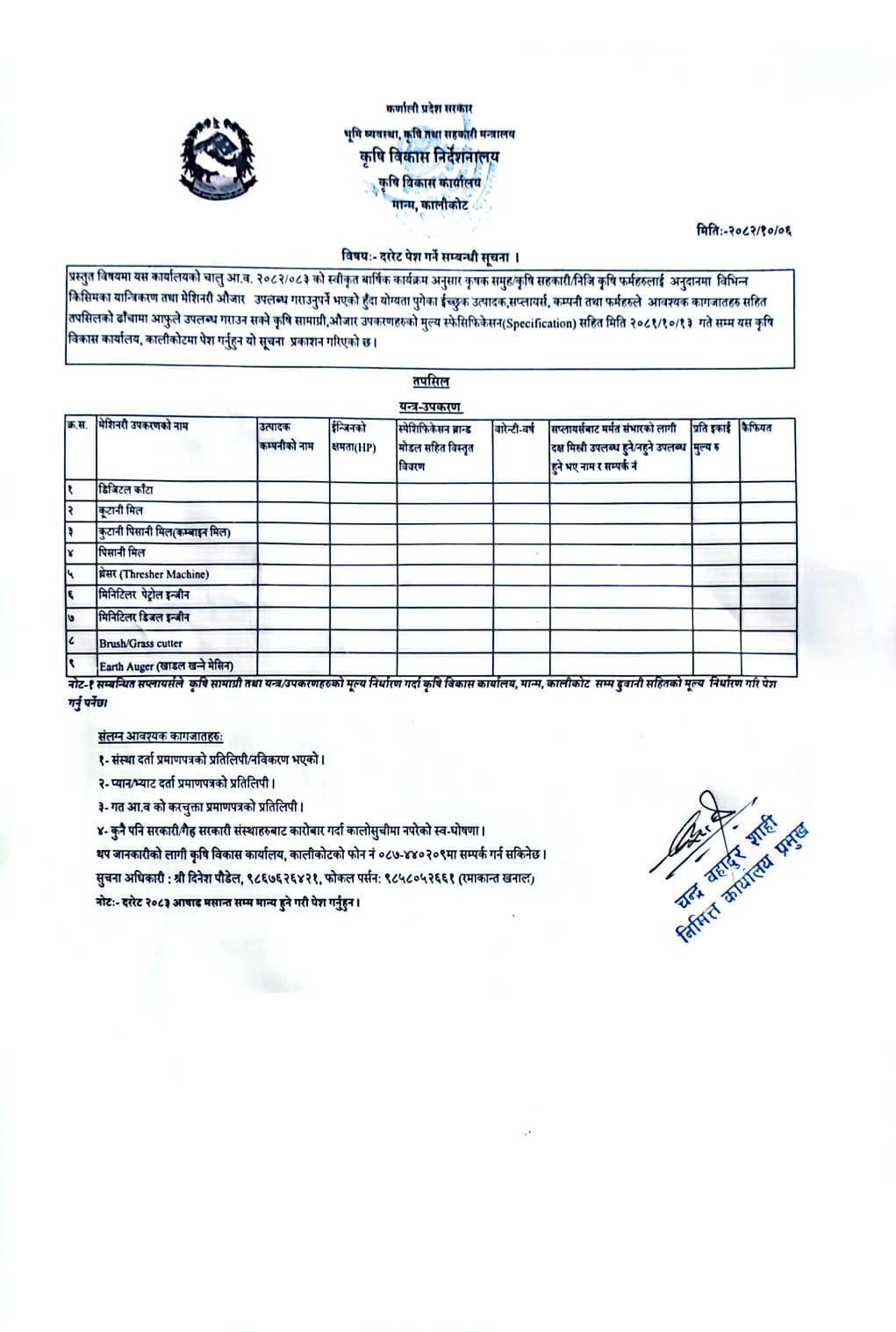 मेसीनरी औजारको दर भाउ पेश गर्ने सम्बन्धी सूचना।।।
